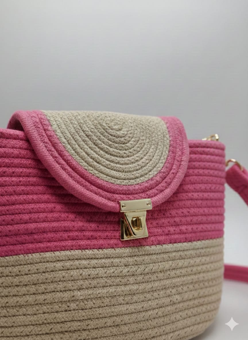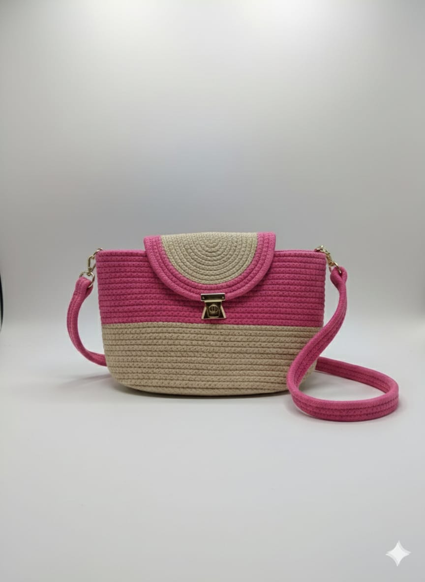 A stylish handmade crochet crossbody bag designed with a beautiful blush pink and sand beige color combination. The elegant round flap and gold lock detail give this bag a chic and classy look.