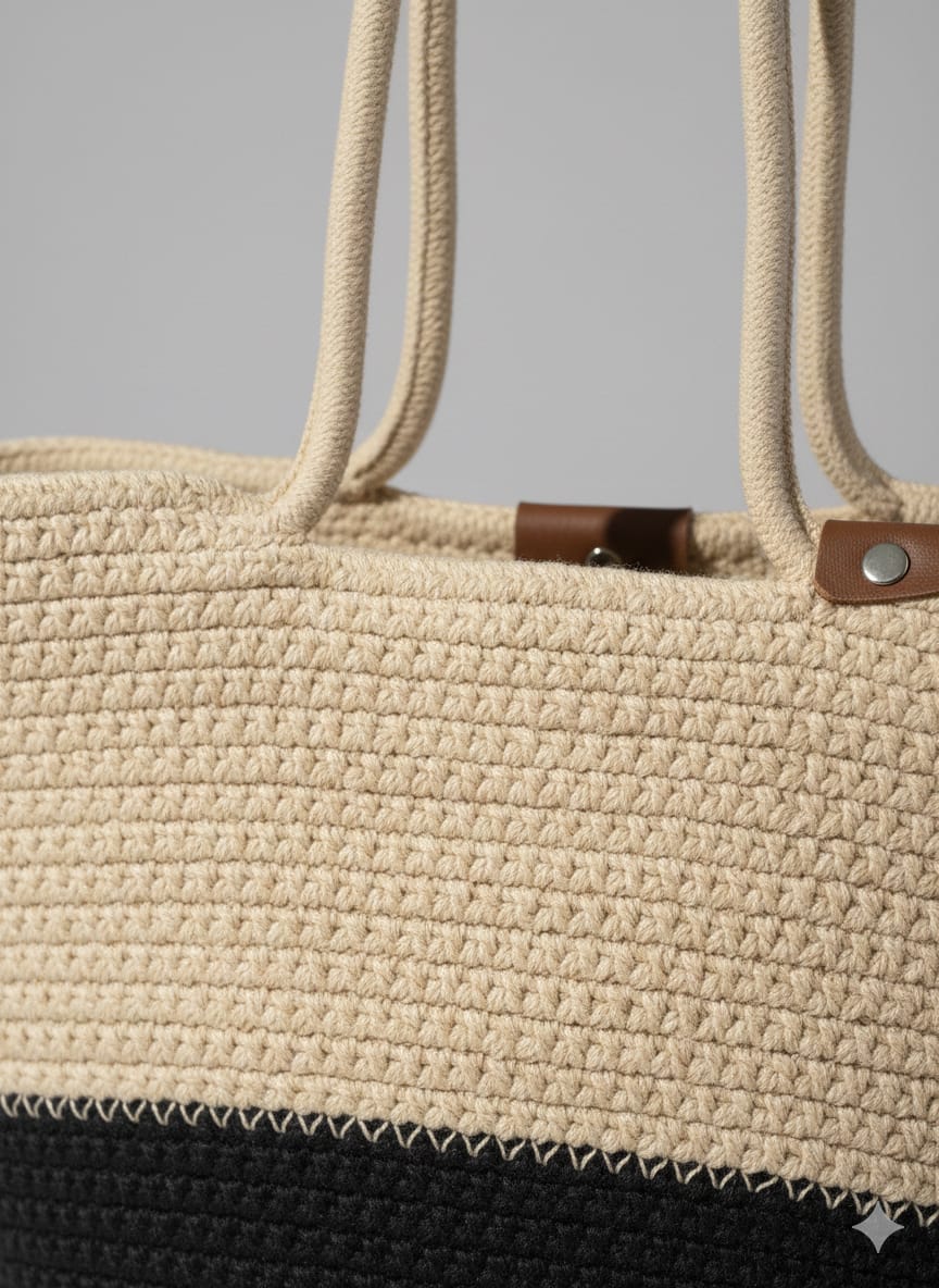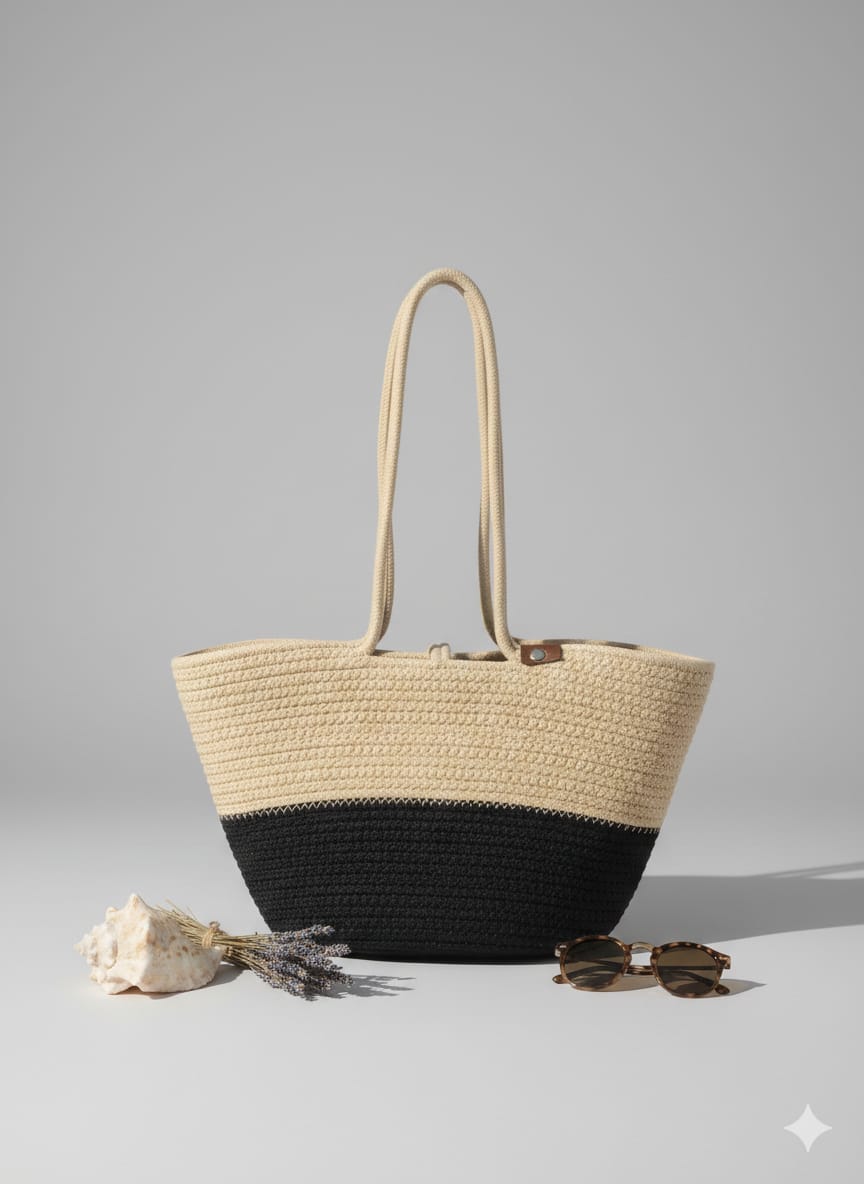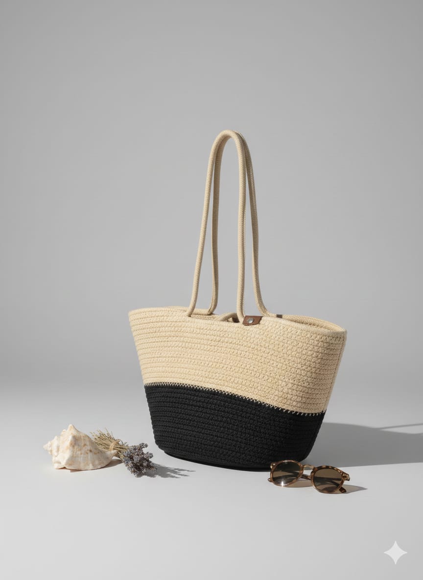 Elegant hand-crochet tote bag with a stylish beige and black dual-tone design. Spacious and lightweight, perfect for daily use, shopping, travel, or casual outings. The soft knitted texture and sturdy long handles provide comfort while carrying. A timeless bag that easily matches any outfit and adds a classy touch to your look.