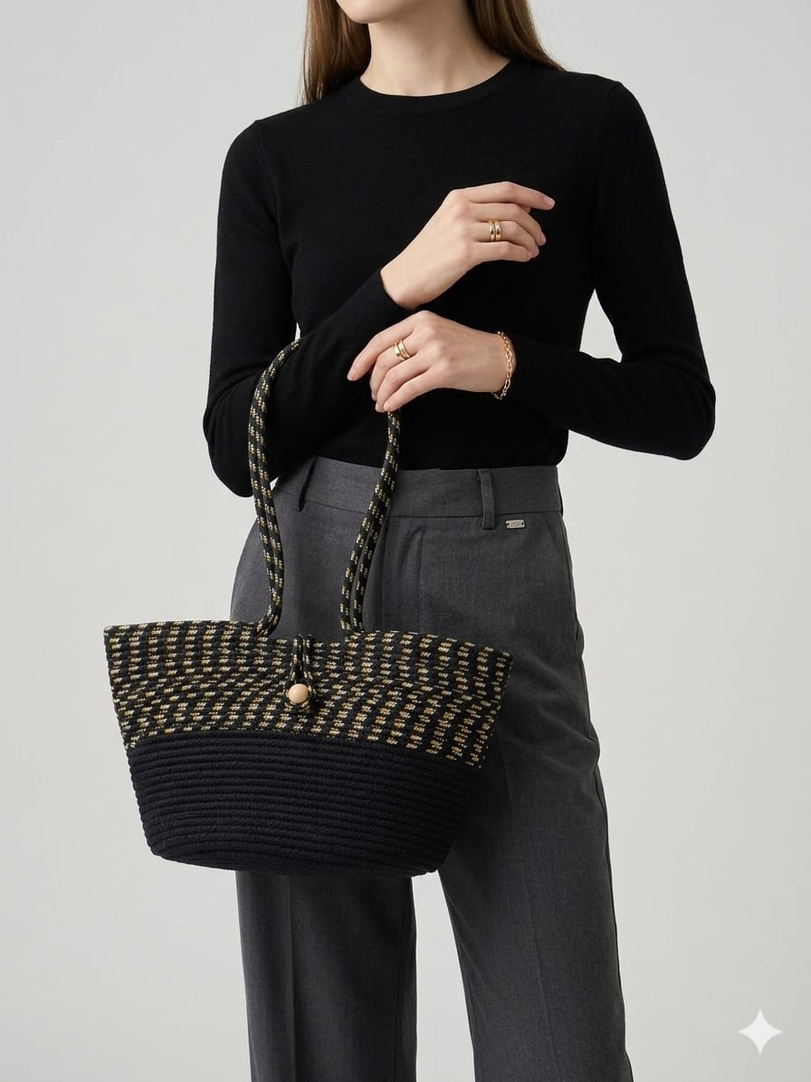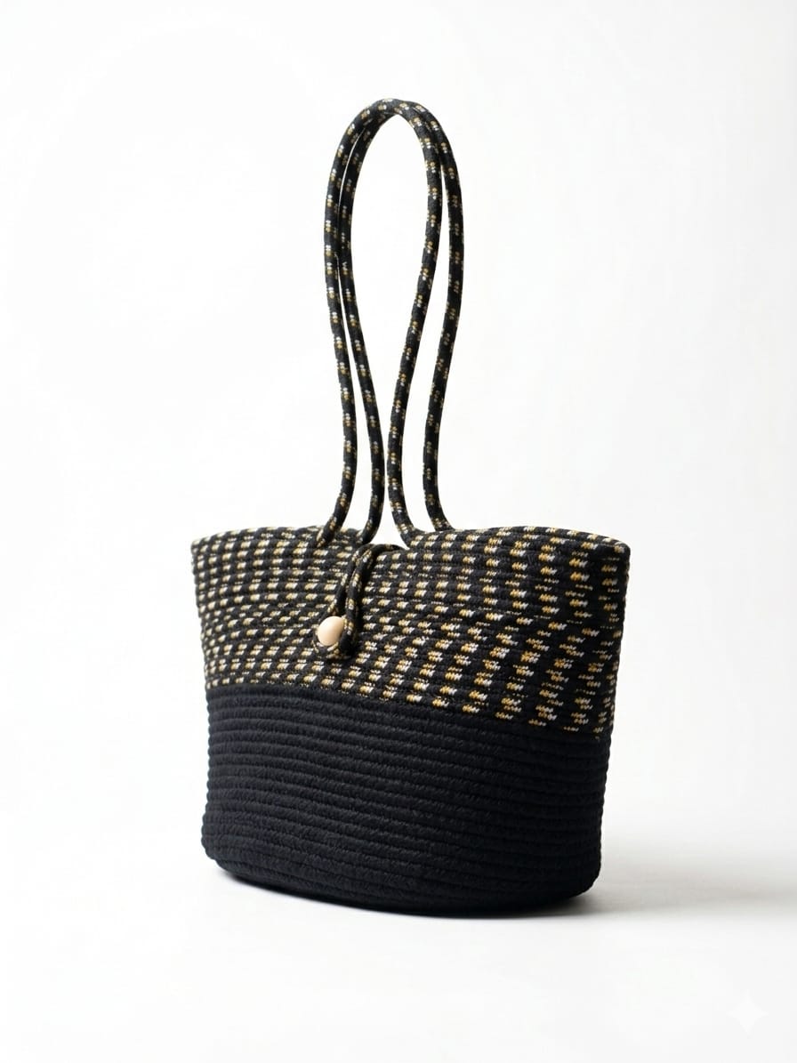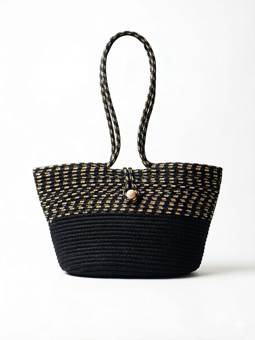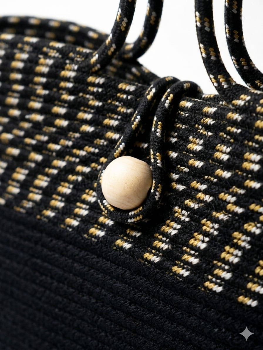 Designed for the modern minimalist, this tote features a luxurious black and gold speckled pattern that transitions into a solid charcoal base. The high-density cotton rope construction ensures durability, while the rustic wooden clasp adds a touch of organic charm to your evening or professional look.