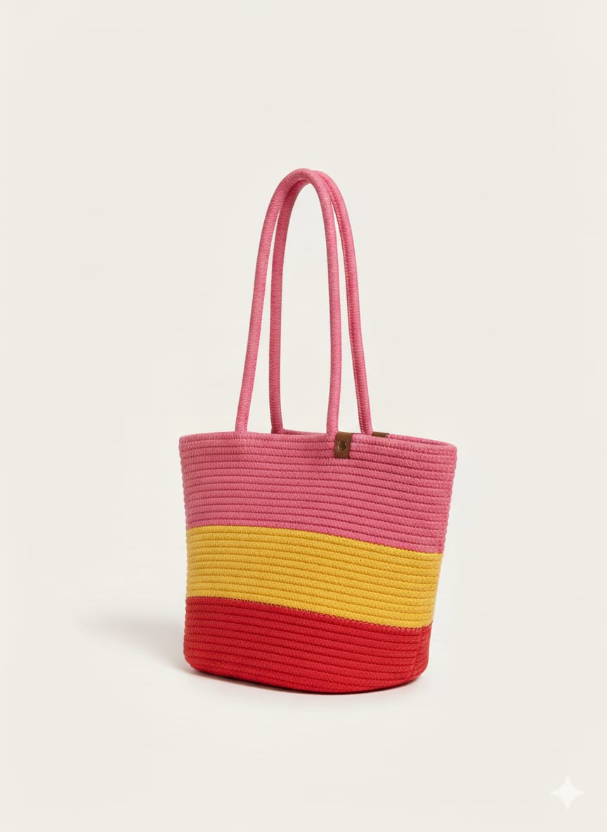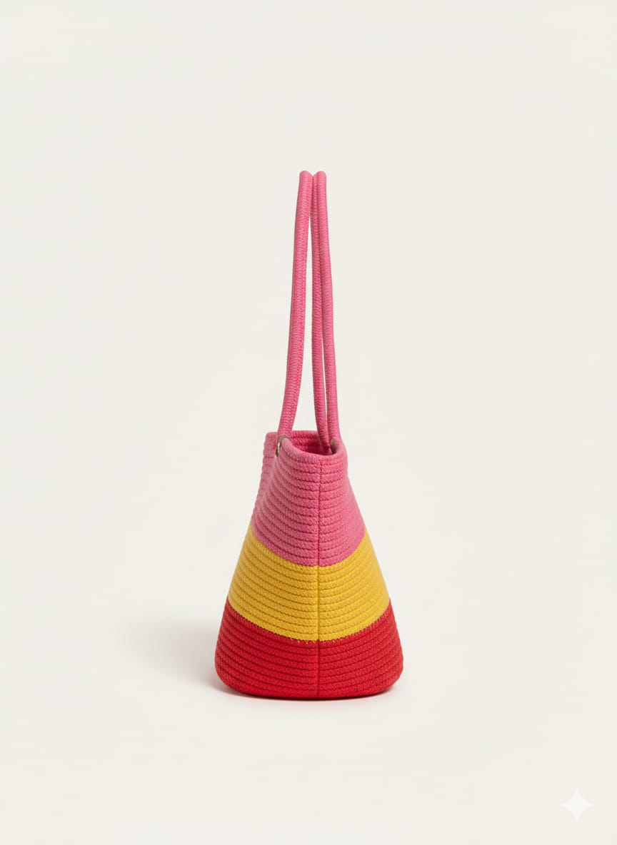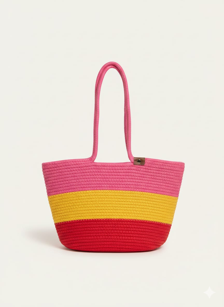 Stylish hand-crochet tote bag with beautiful pink, yellow, and red sunset stripes. Lightweight yet spacious, perfect for daily use, shopping, or casual outings. The soft knitted texture and comfortable long handles make it easy to carry while adding a trendy look to your outfit. Durable, fashionable, and ideal for summer styling.