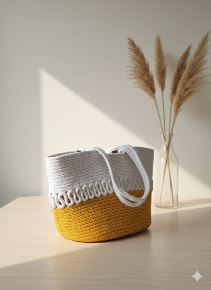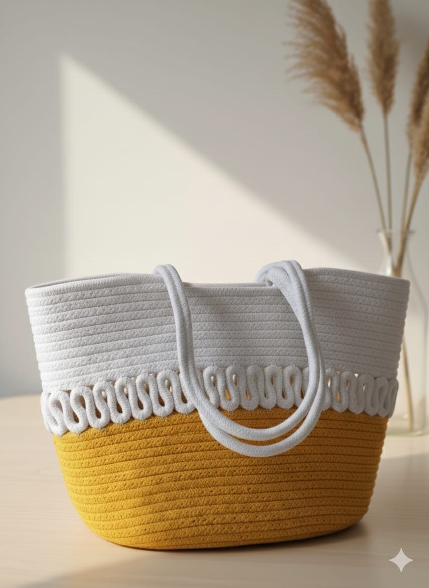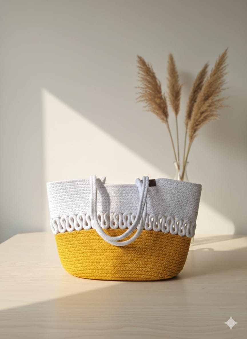A beautiful handmade crochet tote bag designed in a fresh white and mustard yellow color combination. The elegant crochet pattern and neat finishing give it a stylish and unique look. It comes with strong and comfortable shoulder handles, making it perfect for daily use, shopping, college, or casual outings. Lightweight yet spacious enough to carry your phone, wallet, makeup, and other daily essentials. This trendy and classy bag adds a bright and stylish touch to any outfit.